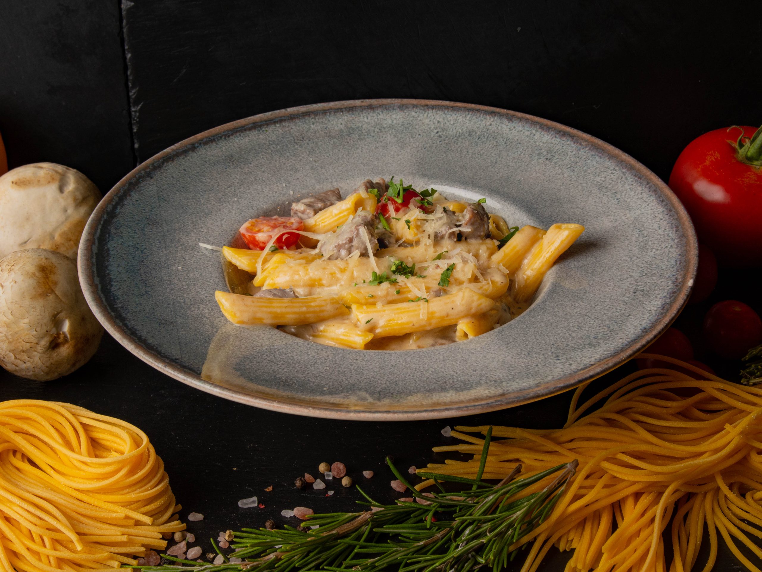 beef tenderloin, wild mushrooms, green onion, garlic, parmesan, cherry tomatoes, cooking cream