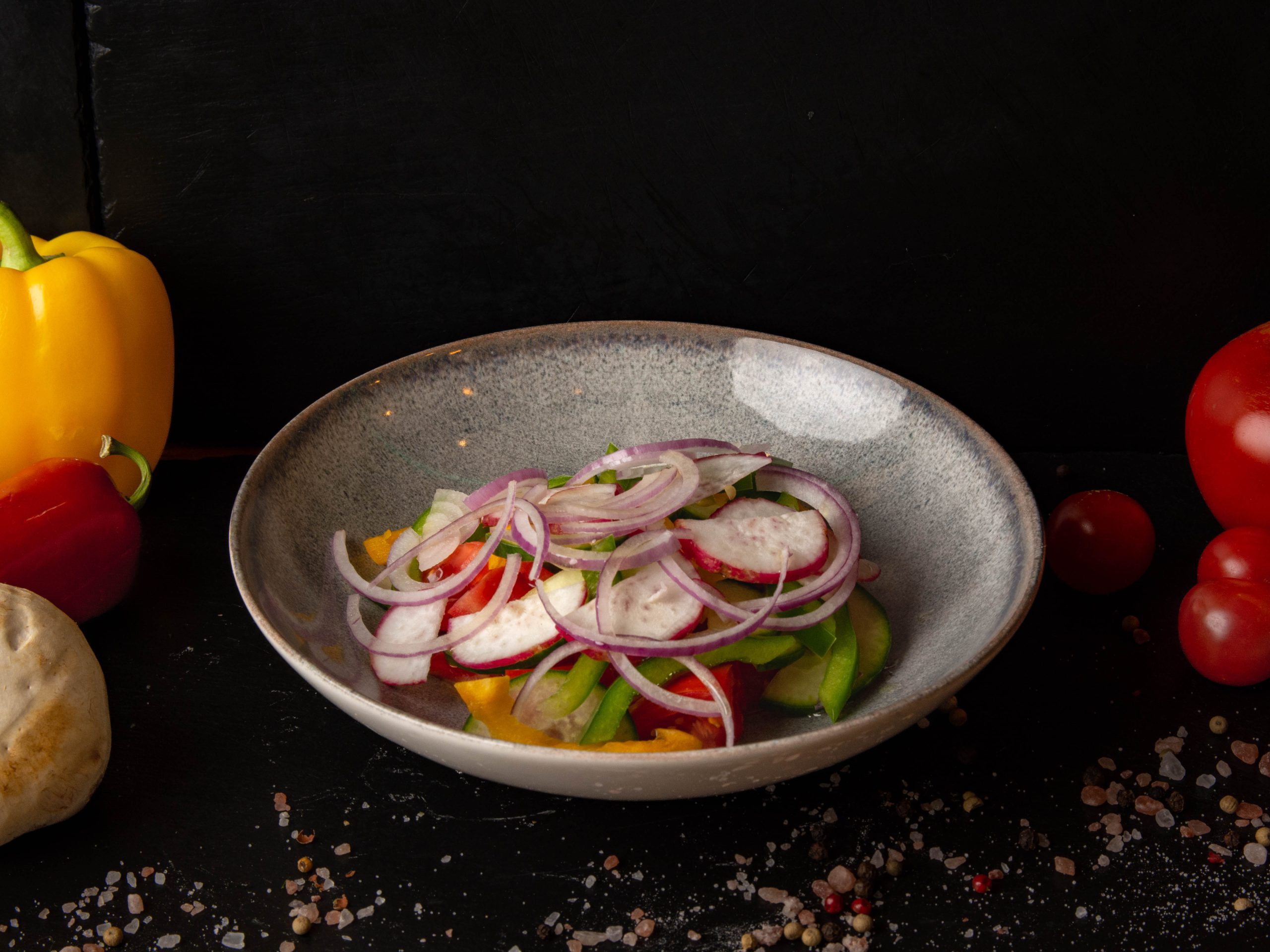 mix de salată, roșii, castravete, ceapă, ardei gras și ridiche